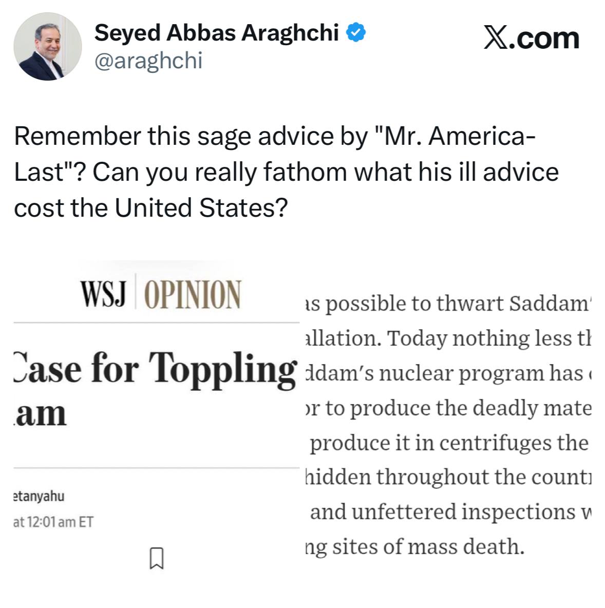 وزير الخارجية سيد عباس عراقجي يذكر بنصيحة السيد أمريكا - أخيراً المشؤومة!