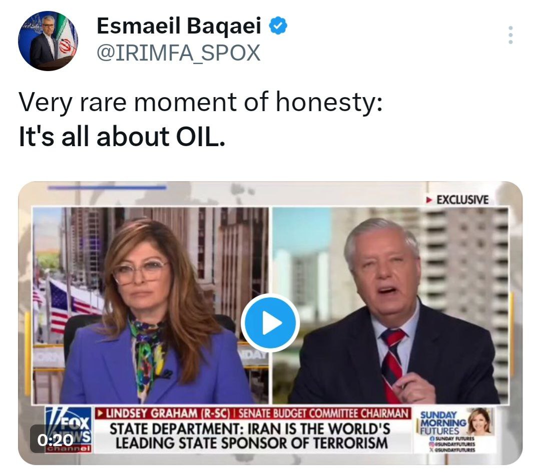 كتب المتحدث باسم وزارة الخارجية إسماعيل بقائي في منشور على منصة إكس، مرفقًا بمقطع فيديو لتصريحات السيناتور الأمريكي ليندسي غراهام، الذي قال فيها: "فنزويلا وإيران تمتلكان 31 بالمئة من احتياطيات النفط في العالم، ونحن سنكون شركاء فيهما."
