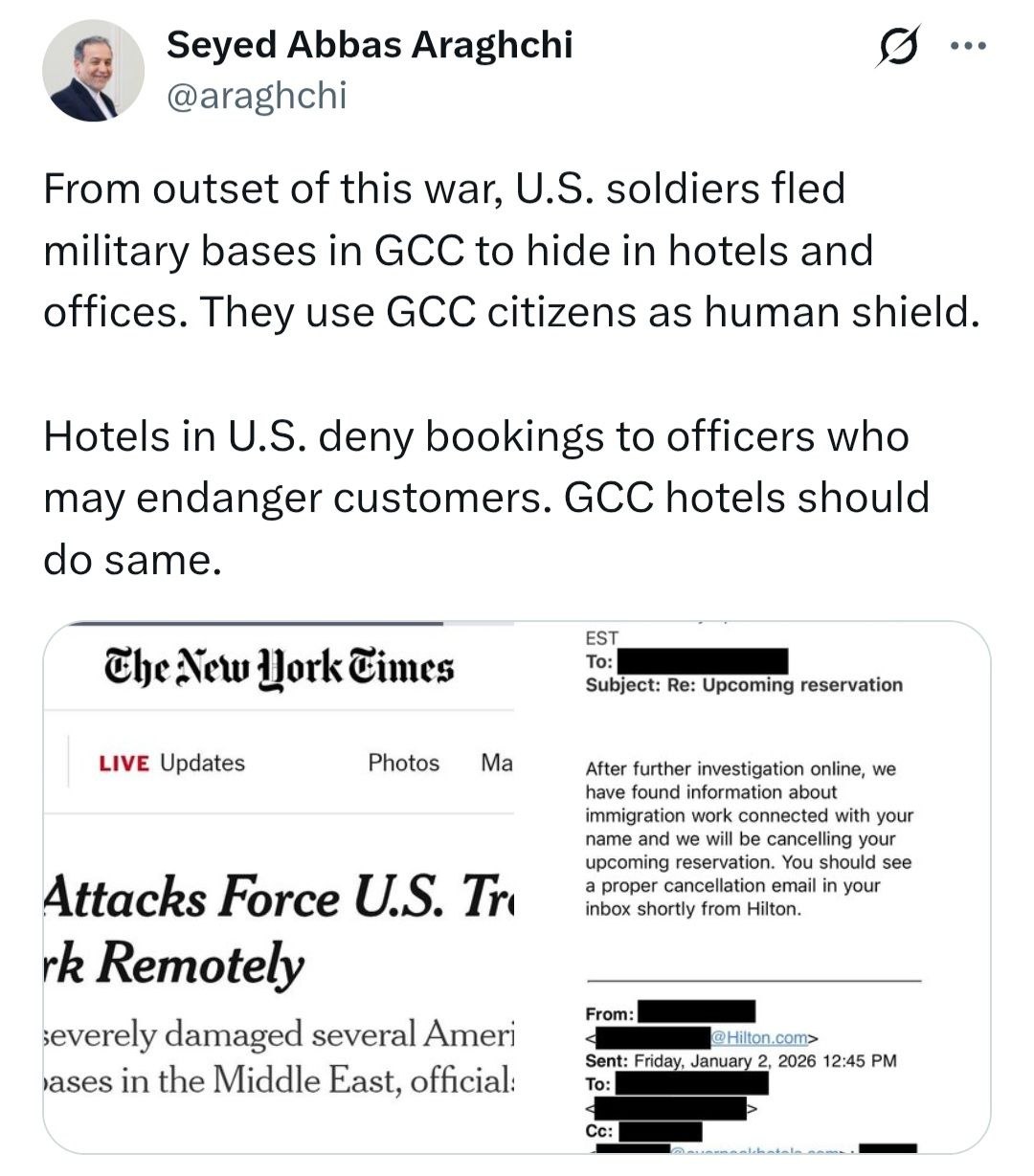 منذ بداية الحرب، غادر العسكريون الأمريكيون قواعدهم العسكرية في دول مجلس تعاون الخليج الفارسي، ولجأوا إلى الفنادق والمباني الإدارية للاختباء؛ إنهم يتخذون من مواطني هذه الدول دروعاً بشرية.