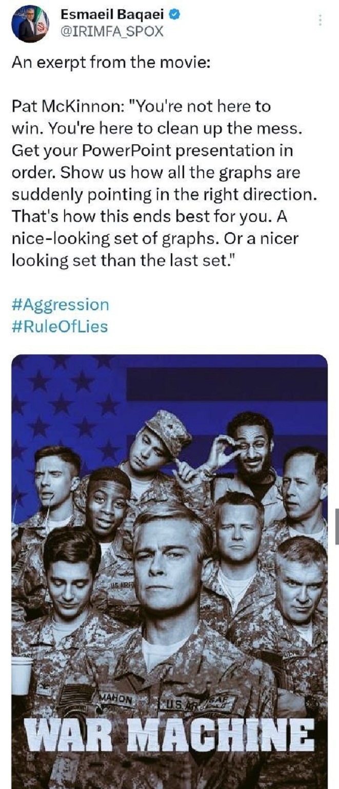 أشار المتحدث باسم وزارة الخارجية إسماعيل بقائي، عبر منشور على منصة إكس تضمن حواراً من فيلم "آلة الحرب"، بشكل ساخر إلى مساعي المسؤولين الأمريكيين لتعويض إخفاقاتهم عبر الخطابات الرنانة وصناعة صور زائفة للواقع: