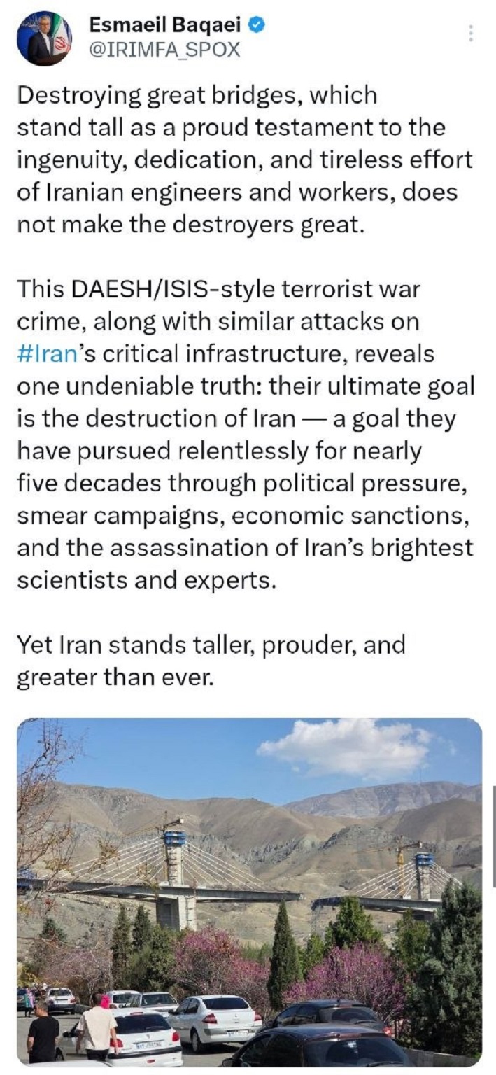 كتب المتحدث باسم وزارة الخارجية إسماعيل بقائي على منصة إكس، رداً على تدمير جسر قيد الإنشاء في كرج من قبل المعتدين الأمريكيين:
